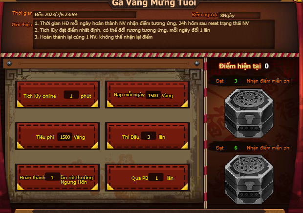 + Tiêu Tốn Phản Hồi: Trong thời gian sự kiện tích lũy Tiêu Vàng mỗi nhận quà theo mốc