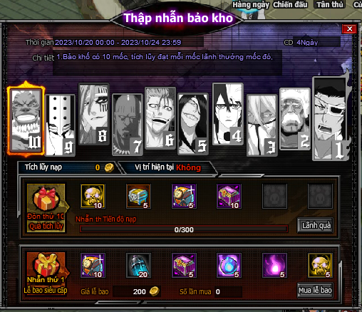 Trong thời gian sự kiện, có 10 Mốc Nạp. Nạp mốc nào sẽ nhận được mốc đó ngoài ra còn có thể dùng Vàng để mua gói quà